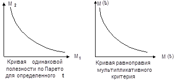 Кривая «равноправия» («равноценности») потребления для различных комбинаций полезности набора одного и того же ресурса М, но в два момента времени t1 и t2, т.е.  М(t1) и М(t2) – на рис. б. В данном случае «равноправие» понимается как одинаковость оценки ресурса М в каждый момент текущего времени (т.е. ресурс М одинаково полезен в любой текущий момент времени). Одинаковость полезности ресурса М в каждый текущий момент времени можно назвать принципом равноправия времени, который формализуется мультипликативной функцией, т.е. произведениями оценок М(t1) М(t2), и потому данная кривая представляет собой гиперболу. Она обладает тем же основным свойством, что и кривая на рис.а: чем больше величина М(t1), тем меньшая добавка М(t2) компенсирует такое же изменение М(t1).