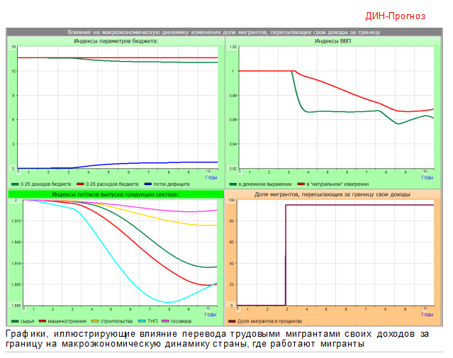 Как видно из графиков, только лишь от одного перевода большей части дохода мигрантов за границу во-первых снижаются доходы бюджета и возникает возможность появления дефицита бюджета. Во-вторых, в целом по стране, уменьшаются потоки выпуска продукции, причем наибольшие снижения происходят в секторах производства товаров народного потребления (ТНП), которые «тянут» за собой все другие сектора сферы производства. Все это вместе взятое, существенно уменьшает ВВП страны.  Если бы трудовые мигранты не переводили свои доходы к себе на родину, а тратили бы их  в стране, где они работают, то в этом случае негативные последствия от перевода денег не возникает. Но при этом начинают проявляться другие негативные последствия виде крупных новых национальных диаспор, искажающих стиль жизни местного населения.