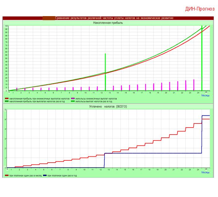 Для иллюстрации этого различия на графике приведен упрощенный результат моделирования этих двух крайних вариантов. В обоих вариантах функционируют два одинаковых упрощенных экономико-математических макета производственного бизнеса, у которых половина всей чистой прибыли расходуется на развитие бизнеса. Динамическое моделирование показывает, что интеграл потока чистой прибыли (интегральная годовая масса сбора налогов) интенсивнее увеличивается у варианта с налоговыми выплатами один раз в год по сравнению с вариантом помесячных выплат.