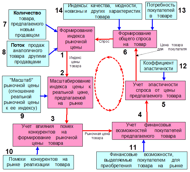 Блоки с 1 по 6 объединены в замкнутый контур единым алгоритмом рыночного ценообразования. При этом на каждый его блок воздействуют различные сигналы (влияющие факторы), формирующие нестационарность преобразований параметров контура ценообразования. Например, на блок 1 влияет величина предложения товара на рынке. Причем, если учитывается предложение продавца, для которого моделируется рыночная цена, то предложения других конкурентов товара в блоке 1 должны учитываться, только в виде потоков продаж товара. Иначе в моделировании возникает ситуация, когда конкурирующие продавцы, имея большие количества предлагаемых товаров, которые никто по каким-либо причинам не покупает, влияют этими непроданными количествами (обычно с незначительным отношением индекса качества товара к его цене) на ценообразование продавца товара большим отношением индекса качества товара к его цене. При моделировании ценообразования в условиях конкуренции, не проданные другими продавцами товары, не должны учитываться как предложения «других продавцов» в алгоритме ценообразования конкретного продавца товара.  Если учитывать весь товар, предлагаемый другими продавцами, то возникает несовпадение прогнозов с реальной динамикой цен.  В корректных алгоритмах моделирования рыночного ценообразования, предложения «других» конкурирующих продавцов учитываются только по суммарной величине потоков реализации их товаров.