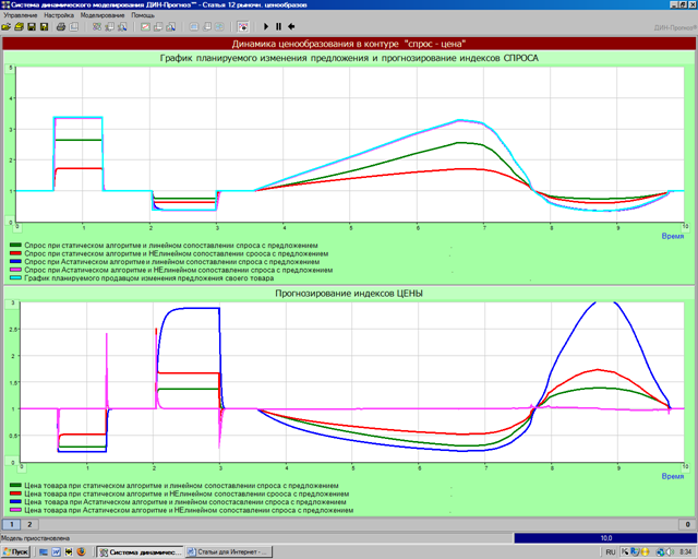 Из приведенных графиков видно, что статический алгоритм более четко «отрабатывает» резкие изменения предложения. Астатический алгоритм очень специфичен. Линейный астатический алгоритм «усиливает» (по сравнению со статическим алгоритмом) динамику ценообразования. Нелинейный же астатический алгоритм «ведет себя» как дифференцирующий оператор – «удерживает» цену товара неизменной (помимо выбросов при ступенчатом изменении предложения).  Моделирование показывает, что при быстрых изменениях предложения целесообразно использовать статический алгоритм ценообразования. Для прогнозирования плавных, медленно изменяющихся процессов лучшие результаты у астатического алгоритма.