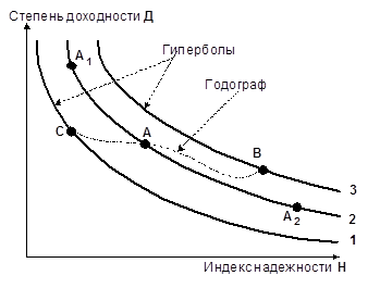 На графике (рис.1) приведены различные значения ИСК в виде гипербол (1, 2, 3,..).  Каждый кредитный договор в координатах (Н, Д) обозначается точкой, определяемой прогнозируемыми доходностью и надежностью (например, точкой А). Переход с одной гиперболы на другую, например, в точку В, соответствует изменению качества финансовой операции по кредитованию, с улучшением ИСК. Перемещение по гиперболе (точки А1, А2) означает сохранение величины ИСК, причем точка А1 характеризует кредитора как рискующего, а точка А2  как осторожного. Переход в точку С говорит об ухудшении ИСК с потерей надежности при одновременном незначительном улучшении доходности.