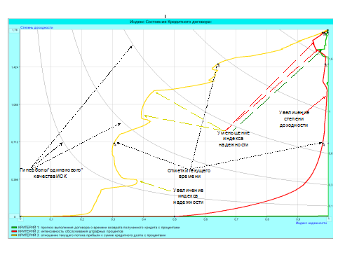 Рис.2. Фазовый портрет, на котором приводятся годографы изменений индексов качества состояний кредитного договора (ИСК) по трем разным критериям для прогнозируемых изменений экономических состояний и условий, возникающих в будущем, как результат реализации полученного кредита.