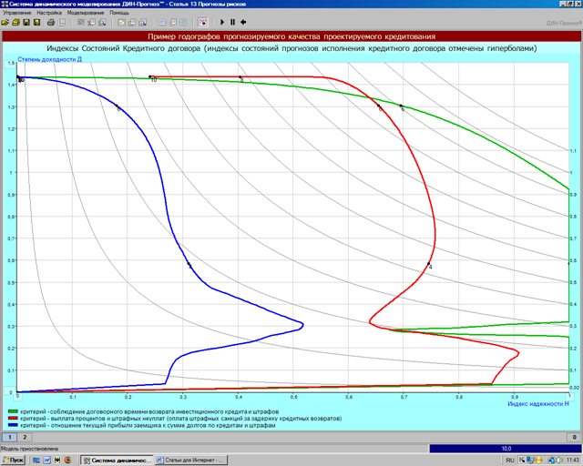 Все эти модели сопрягаются в единую общую динамическую модель, структура которой непрерывно изменяется от воздействия множества моделируемых и экзогенных факторов, аналогично тому, как это будет происходить в будущем в реальной жизни.  Кредитующий банк, закладывая в общую динамическую модель все исходные данные бизнес-плана кредитуемого, в результате моделирования прогнозирует траекторию годографа А-В-С в координатах «индекс надежности – степень доходности». На этой траектории (годографе) кредитующий банк сможет определить негативные для себя такие участки годографа. Важно отметить, что прогнозирование индекса надежности возврата кредита по условию кредитного договора выполняется на модели, структура (архитектура) которой будет соответствовать архитектуре всех моделируемых экономических оригиналов, учтенных в комплексе.