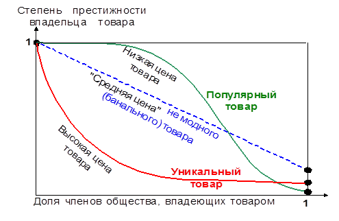 Снижение цены товара меняет зависимость «престиж – количество владельцев» от причисления себя к «элитной» социальной группы на причисление себя к социальной группе «стада». Примерами этого может служить – молодежная мода на современную музыку или на одежду определенного вида – например, джинсы и т.п.