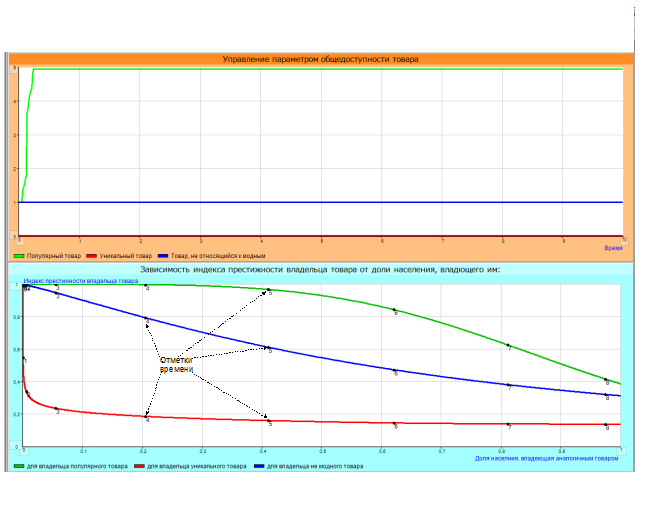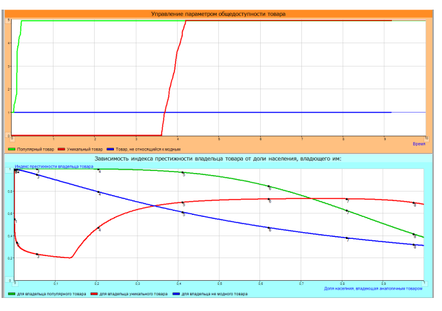 Рис. 2. На верхнем фрагменте экрана монитора выполнены управления тремя одинаковыми моделями с различными свойствами реализуемого товара, а на  нижнем фрагменте экрана монитора приведены результаты моделирования характеристик престижности владельцев товаров с тремя различными свойствами (популярный, уникальный и не модный)