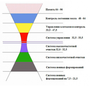 Вся информация о структурах и свойствах живых клеток содержится в мозге, а не в ДНК, поскольку во втором случае имеются только некоторые неполные копии. Кроме того, структура ДНК – это своего рода «конвейер», на базе информации которого производится только сборка «изделий». Информация заложена в самих «изделиях». Условно, иерархия основных функций мозга по октавам указана на рисунке. Мозг – сложнейший комплекс, его нельзя создать из «пыли», как принято догмами современной науки, поскольку сама планета Земля якобы собрана из космической пыли, по их мнению. Мозг есть результат многомиллионного периода времени (в астрономическом исчислении времени) формирования биоструктуры, приведший к связанному одновременному состоянию его в  трех пространствах (состояниях), а именно нейтринного (высшего), антинейтронного и протонного, или ионного.
