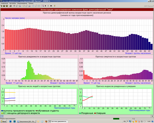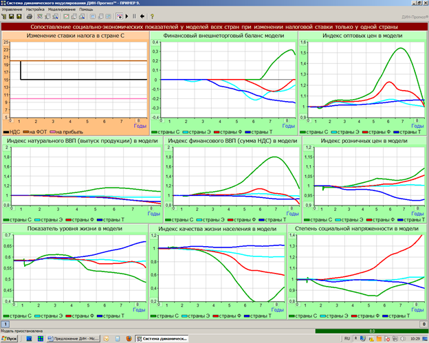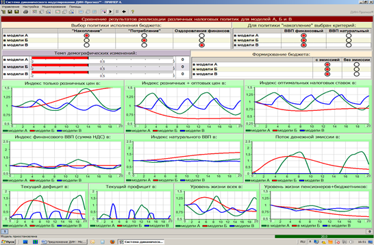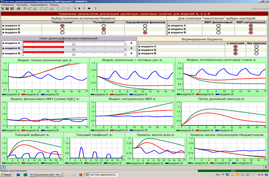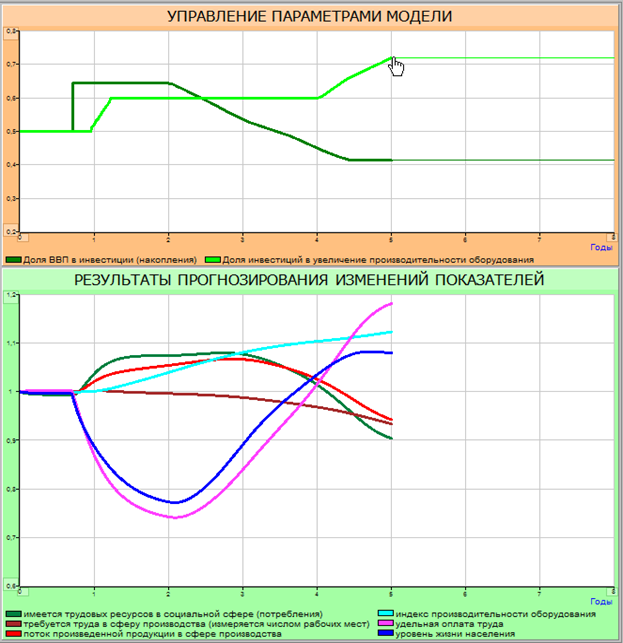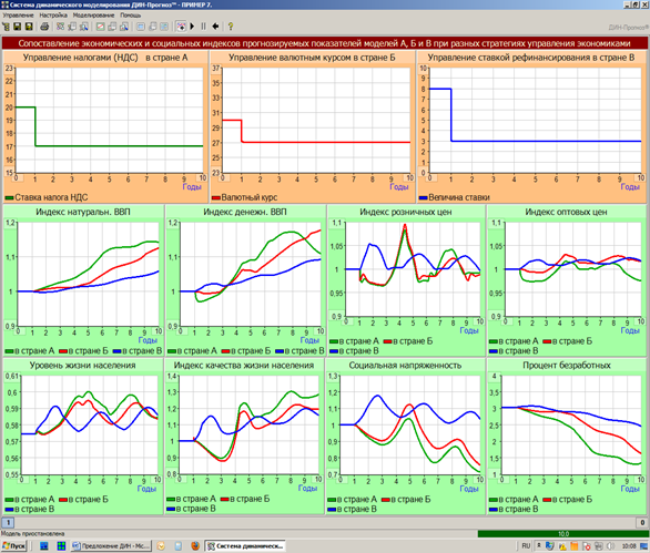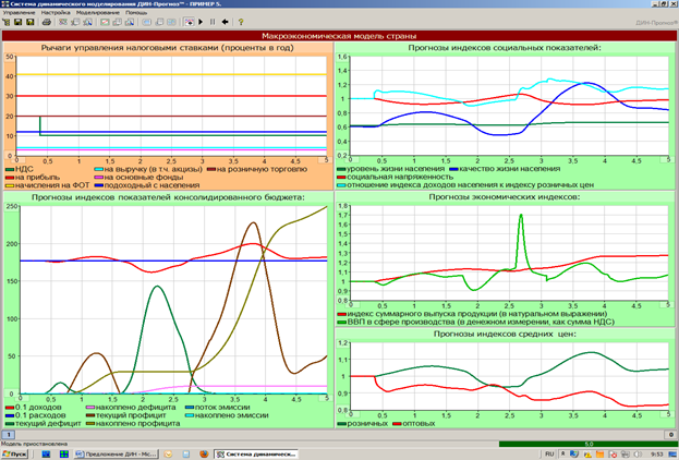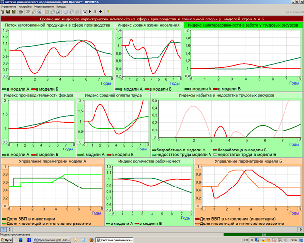 Приведён пример управлений (бежевая рамка фрагмента наверху экрана) параметрами динамической модели страны, которые выполняются в процессе прогнозирования, без его остановки. Результаты изменений экономических показателей приведены на фрагменте в зеленой рамке внизу экрана. Путем различных комбинаций управления двумя рычагами распределения ресурсов на макроуровне выполняется поиск наиболее приемлемой стратегии распределения (на основании анализа индексов развития производства, уровня жизни, наличия безработицы и др.) Прогнозируемые здесь траектории невозможно вычислить традиционными методами, т.к. они наблюдаются как «хаотичные» (по А. Пуанкаре и А.Н.Колмогорову), имея при этом детерминированное математическое описание. Детерминированное описание «хаоса» позволяет не только осуществлять повторяемость результатов моделирования, что обеспечивает выявление первопричин будущих неприятностей, которые появляются задолго до их проявления (как следствие изменений экономических структур), но, главное, прогнозировать ранее непредсказуемые будущие резкие изменения параметров объекта, первопричины которых могут быть выявлены при повторных моделированиях, что невозможно сделать традиционными методами прогнозирования.