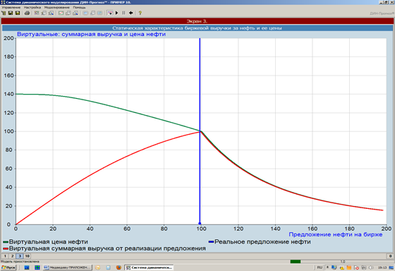 Биржевая взаимозависимость предложения нефти, её цены и выручки приведены на иллюстрации 10.1, для условий равенства предложения спросу. Демонстрационная модель в исходном состоянии настроена на максимальную выручку. Из графика видно, что при превышении предложения над спросом, цена нефти снижается интенсивнее, чем она увеличивалась при недостаточном предложении.