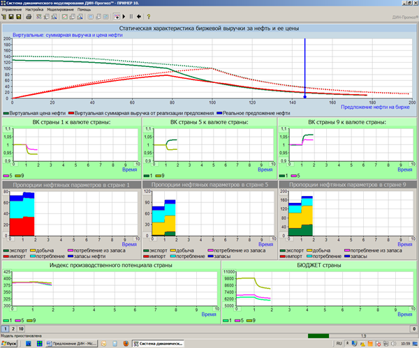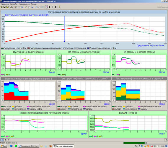 В приведенной здесь модели торгов, на нефтяной бирже участвует 9 стран с одинаковыми экономиками. Они взаимодействуют между собой всеми видами, выпускаемой у каждой из них, продукции. Поэтому нефтяная торговля является только частью всего их внешнеторгового оборота. Однако торгуемая нефть служит основой их экономик (сфер производства и потребления у всех стран), влияя на производство продукции в каждой стране (и на спрос тоже). Одинаковые модели стран отличаются только тем, что страны 1, 2 и 3 лишь импортируют недостающую им нефть. Страны 7, 8 и 9 экспортируют нефть всем другим странам, если добывают больше чем им надо для своей страны. Страны 4, 5 и 6 могут быть то экспортерами, то импортерами, в зависимости от возникающих условий. Здесь приведена динамика только трех стран из девяти: одна страна импортер (страна 1), одна страна экспортер (страна 9) и одна страна с изменяющимся экспортом-импортом (страна 5). Для этих трёх стран на монитор выведено несколько вспомогательных графиков-прогнозов, упрощающих анализ получаемых результатов (см. рис. 10.2 и 10.3). Важным прогнозируемым показателем для международной торговли является валютный курс (ВК) национальной валюты, который существенно влияет на внешнеторговую динамику страны. Параметры государственных бюджетов используются для прогнозирования военно-политических амбиций стран.