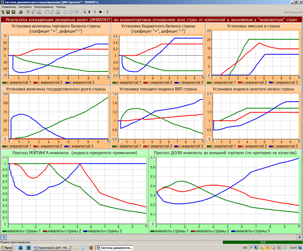 Приведёны результаты прогнозирования динамики трех конкурирующих резервных валют (кратко, они здесь названы инвалютами, тогда как не резервные валюты других стран, называются национальными валютами) трех стран: 1, 2 и 3. В зависимости от изменения фундаментальных факторов, которые вычисляются в модели международной внешней торговли (в демонстрируемом здесь примере некоторые фундаментальные факторы вместо трансляции их из экономической модели мира, «задаются» вручную на верхних фрагментах с бежевыми рамками), прогнозируются изменения рейтингов этих инвалют, и их доли во внешнеторговом обороте. Модель конкуренции инвалют позволяет прогнозировать чередование рейтингов, выявляя наиболее приоритетную инвалюту (ранее не приоритетная инвалюта может оказаться наиболее востребованной во внешнеторговых операциях) в различные интервалы будущего времени. Тем самым прогнозируется смена рейтинга применяемости инвалют (прогнозы достаточно корректны).