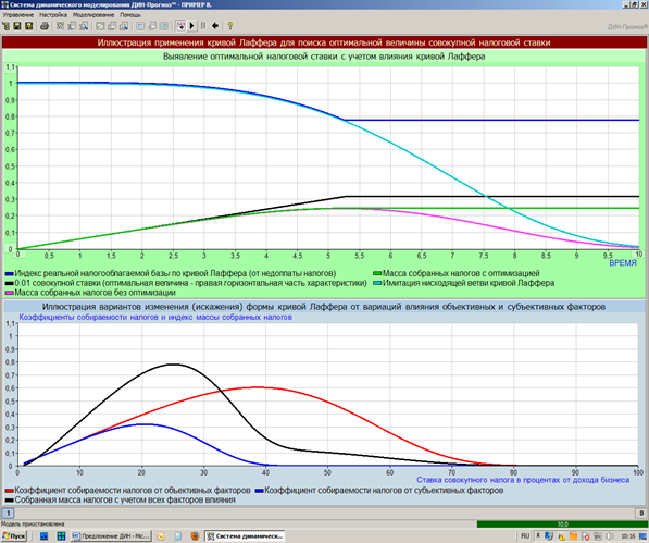 На графике нижнего фрагмента результат моделирования двух групп факторов влияния на изменение собираемости налогов: объективные, обусловленные финансовым давлением на развитие бизнеса, и субъективные, обусловленные недостаточностью личных доходов владельца бизнеса. Эти два фактора объединяются (не суммируются) алгоритмом в виде сложной свертки показателей, что позволяет получать прогнозы близкие к реальным результатам. Эта свертка в некоторых ситуациях, искажая форму кривой Лаффера (см. на нижнем фрагменте результирующий черный график), корректно прогнозирует функцию сбора налоговой массы при большой величине совокупной налоговой ставки.