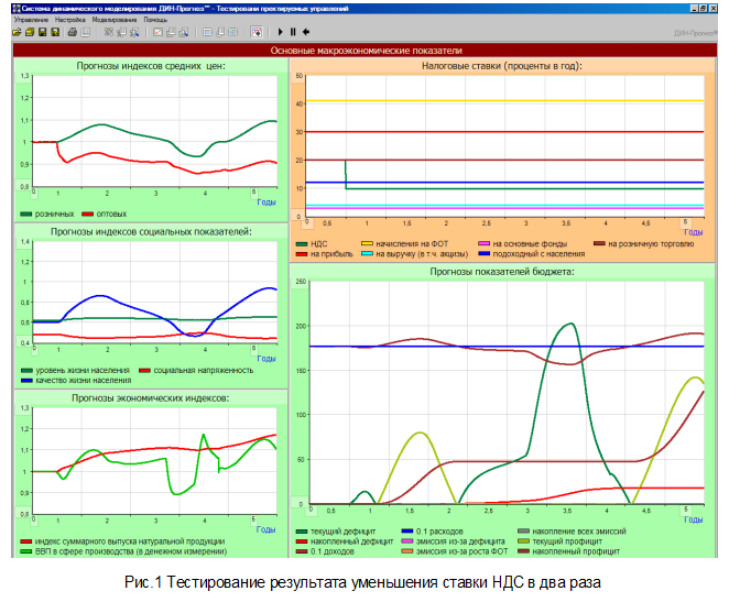 На рис.1 приведен результат реализации уменьшения ставки налога на добавленную стоимость (НДС) в два раза в виртуальный момент моделирования Т=0.5. Тестирование проводилось с учетом того, что экономика (в динамической модели) страны «условно» сбалансирована и поэтому все параметры модели от Т=0 до Т=0.5 не изменяли своих величин. Такой прием моделирования позволяет выявить даже незначительные изменения параметров при каких-либо изменениях управляющих факторов. После изменения ставки НДС в модели возникли различные дисбалансы, которые вызвали изменения параметров модели. Как видно из приведенных результатов моделирования, не все изменения параметров благоприятны для социально-экономического функционирования. Результат моделирования показал, что сначала немного возрос дефицит бюджета, но затем возник его профицит, который продолжался около одного года. Затем стал возникать очень большой дефицит бюджета в продолжении 2.5 лет, после чего снова появился профицит.