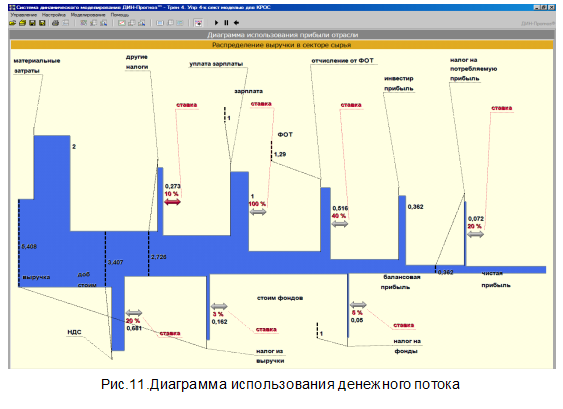 Пример одного такого интерфейса для наблюдения за потоками выручки отраслей (корпораций, фирм и др.) приведен на рис. 11. В процессе прогнозирования диаграмма все время претерпевает изменения своей формы, что позволят наблюдать распределение новых потоков.