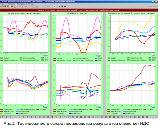 Наблюдаемые на рис.2 и 3 изменения параметров сферы производства динамической модели народного хозяйства страны позволяет выделить положительные и негативные результаты одноразового уменьшения НДС на различных интервалах времени прогнозирования.