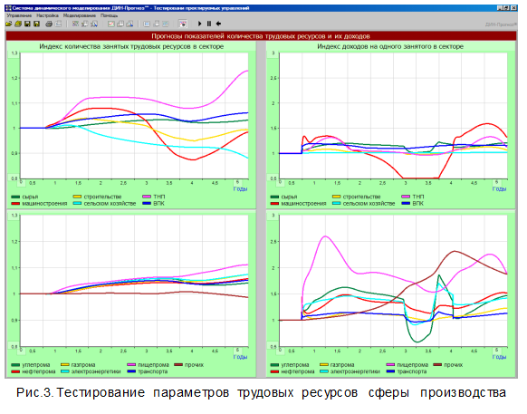 2) На втором этапе выполняются запланированные управления, и наблюдается результат их реализации в виде прогнозируемых траекторий показателей, выведенных на экраны мониторов. Практически всегда на этом этапе прогнозируемые результаты очень сильно отличаются от желаемых. Для «приближения» прогнозов к желаемым изменениям выполняется многократные повторения моделирования с поиском дополнительных управлений, по отношению к ранее запланированным, на всем интервале времени прогнозирования. Причем этот интервал должен превышать в 2 – 3 раза интервал времени, для которого проводится тестирование. Если при этом не будет найдено нужной комбинации набора управлений, дающих удовлетворительный результат прогнозируемых процессов, то необходимо переходить к третьему этапу, на котором производится доработка модели с поиском новых алгоритмов, изменяющих структуру моделируемого объекта и/или исключением ранее установленных алгоритмов.